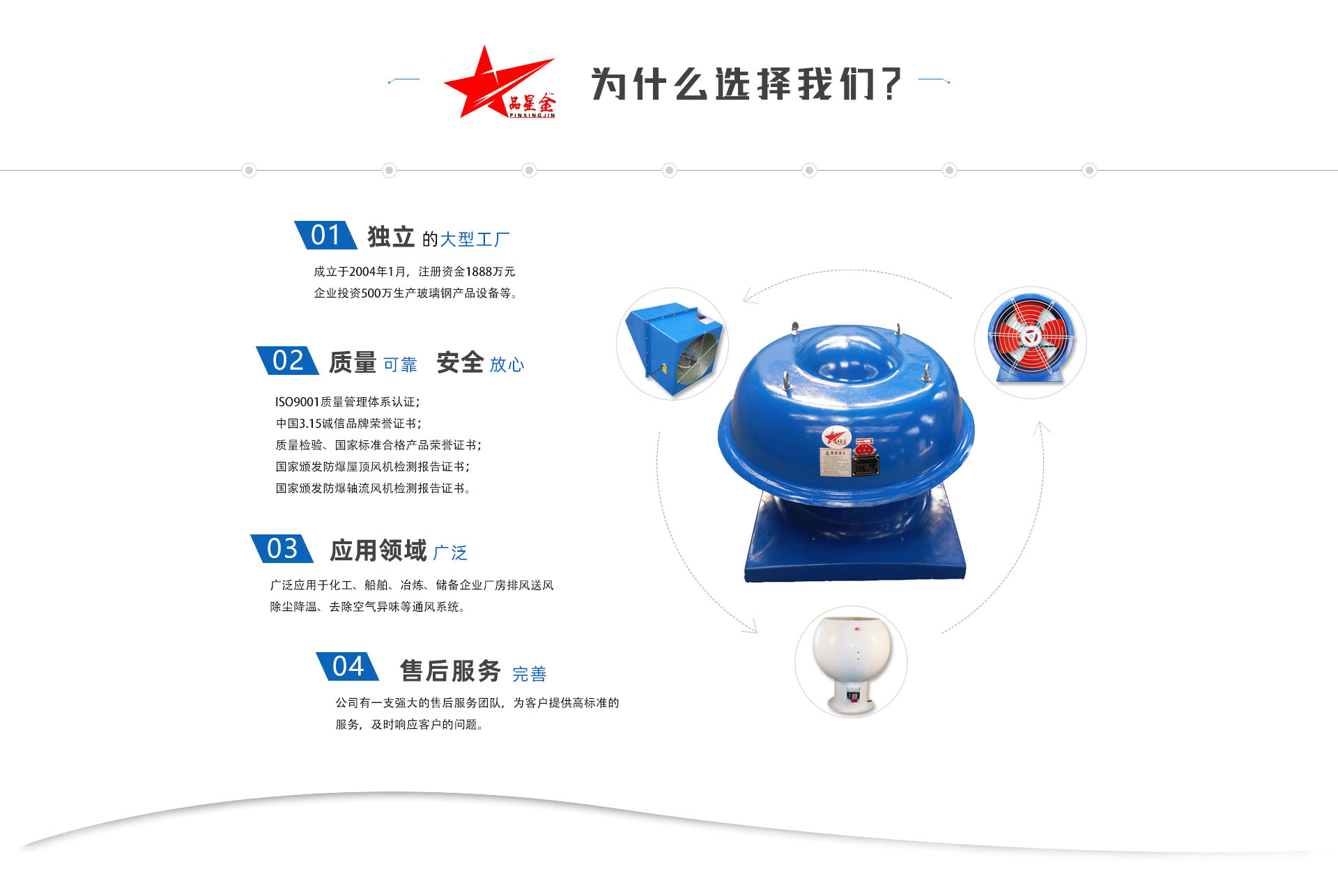 公司生產屋頂風機、玻璃鋼防爆屋頂風機、玻璃鋼防爆軸流風機、玻璃鋼防爆邊墻風機、防爆軸流風機、玻璃鋼斜流風機 、玻璃鋼離心風機 、玻璃鋼防雷防爆電動風帽 、玻璃排氣扇 、玻璃鋼通風器 、玻璃鋼防雨風機帽 、玻璃鋼冷卻塔、新風機組、風機盤管、風量調節(jié)閥、鋁合金風口 、各種材質通風管道、等產品。
